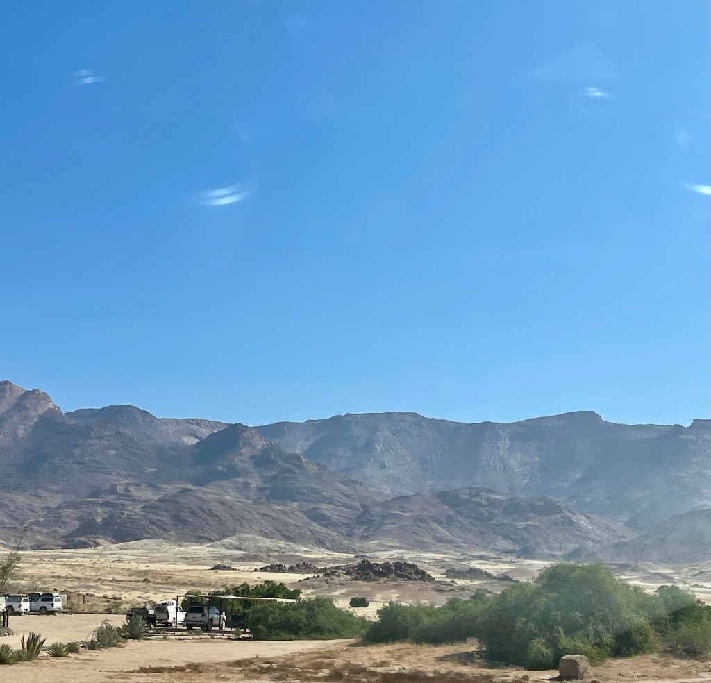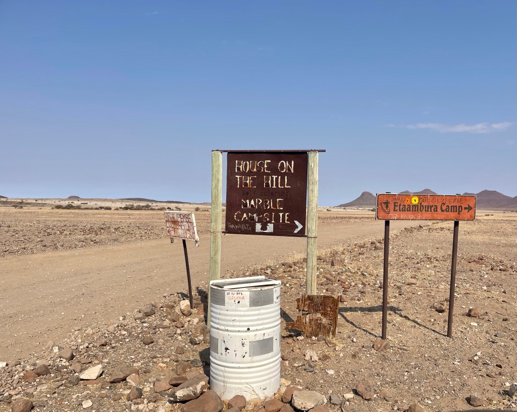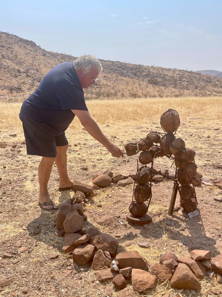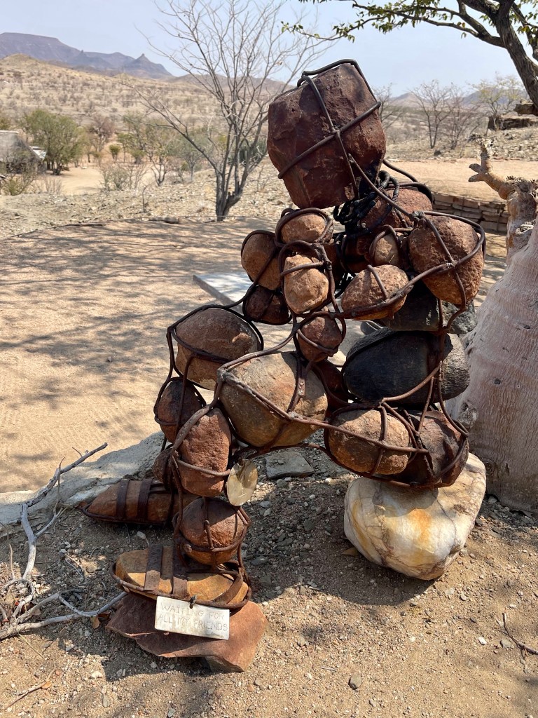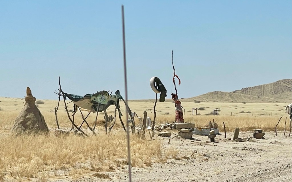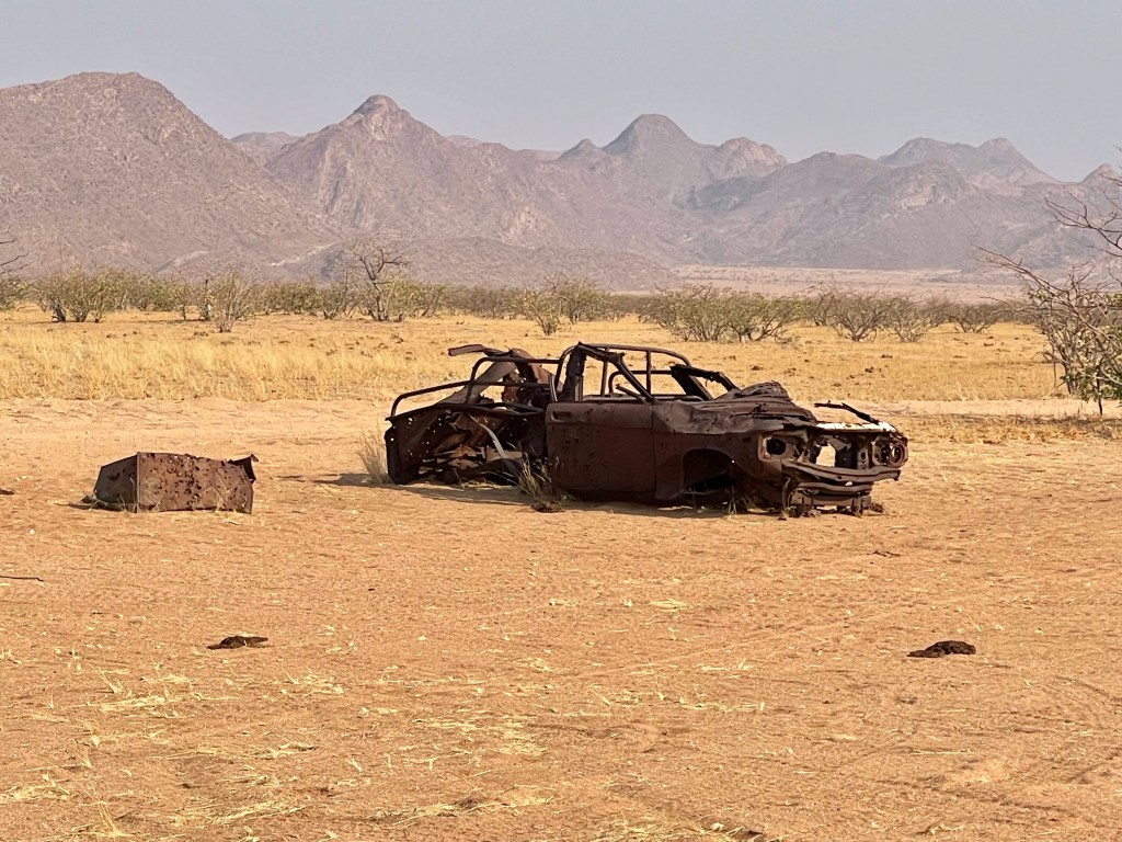 We pass the Himba Holy Mountain from the other side before retracing our steps to Rooidrom. It seem hard to believe that this remote, tranquil area was a base for the border war. A stark reminder is the wreck of a car that had been blown up by a land mine.