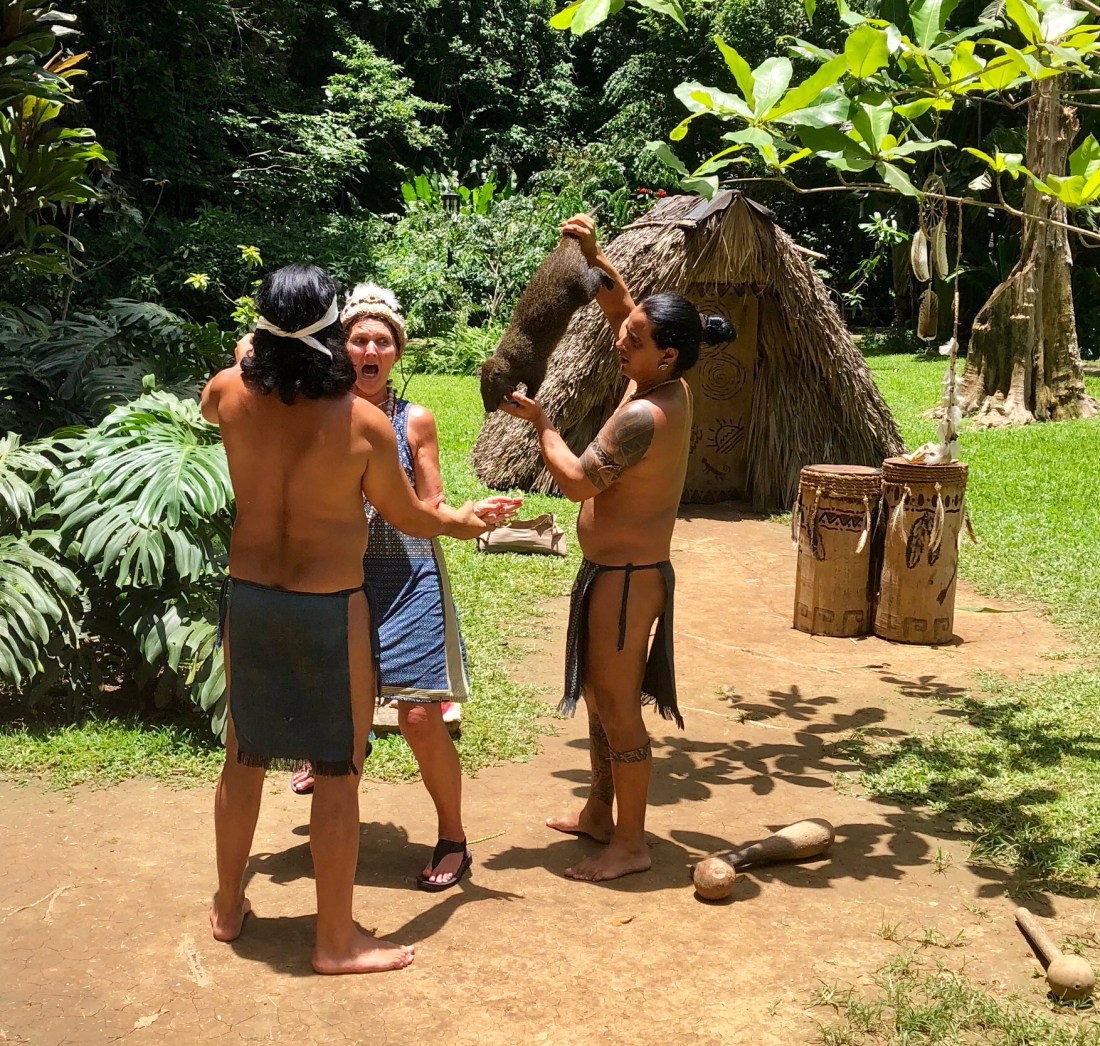 We then visited caves in the area. Our first bit of entertainment was when a local creole native grabbed Jean, she yelled (we laughed) and proceeded with some sort of ceremony, I sure they are now married. Then his mate put this massive cane rat on her head, she yelled, we laughed, then took turns with this cute rodent crawling over us.