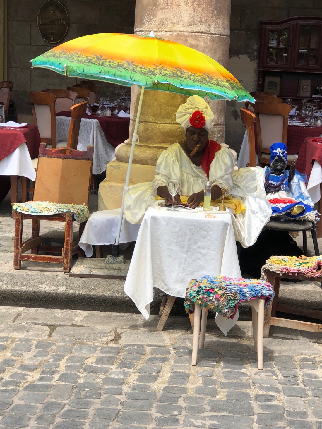 Around 6pm we strolled back into town, it takes on a different look and feel as the sun starts to set. It is a feel of the days work is done and life is now to be savored and enjoyed. We found a courtyard pub, framed with beautiful old mango and avo trees. We ordered rounds of the most outrageous cocktails, having no idea what was in them, all our kids would have proud (or maybe not after round 2). Everywhere we go we peel back layers of this amazing and interesting country. It turns out the pub is owned by the temple next door and even the blue table cloths have meaning. Looking into the temple – a blue house on the outside with a large interior white room, housing only a black doll, dressed in white, sitting on a chair. Wish I knew more, other than she must depict one of the Saints.