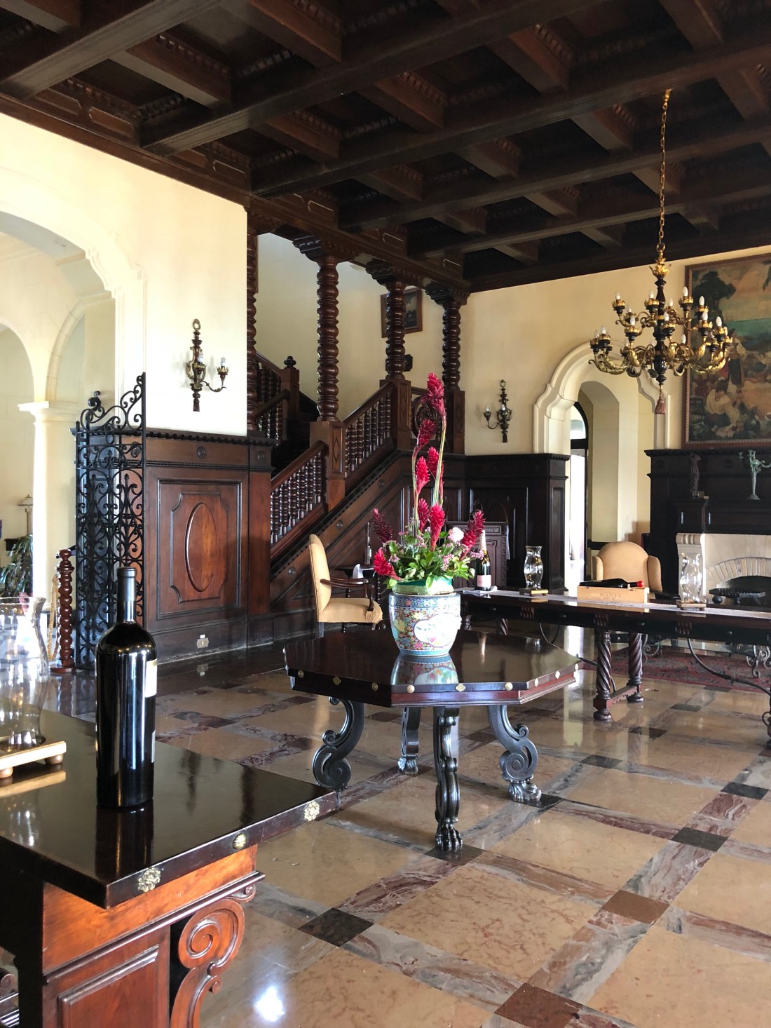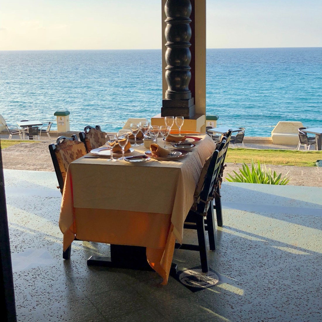 We went past the Diesel’s room to pick them up for our all inclusive dinner in the hotel canteen. Wayne had however discovered that he had set aside 100 pesos and forgotten about it. This put a whole new spin on our dinner plans. We asked reception for recommendation for a restaurant in town with a sunset view. They recommended Du Pont, which was out of town. As we were splashing out, we drove in style in a pink 1950 Chev. Du Pont was a mansion built between 1920 and 1930 and cost a whopping $1 000 000, at the time. It is on the sea and surrounded by a golf course. We went on a tour of the house from the basement wine cellars, to the library with original masterpieces, to the beautiful views of the third storey, now a bar. We sat on the veranda and delighted in our meal of veal and duck, washed down with a Faustino Rioja. The sunset dinner was one to remember.